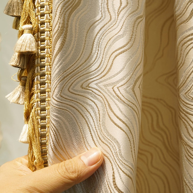 - Ohromující zlatý dekor: Bohaté třásně, lemování a jemné vzory dodávají závěsům jedinečný luxusní vzhled.
